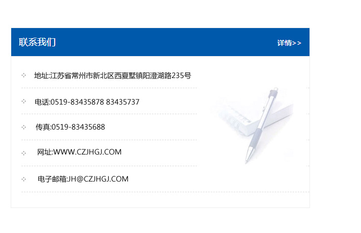 地址:常州市新北區友邦商務大廈1幢16、17層  電話:0519-85101652  傳真:0519-85112595  郵編:213022  網址:www.cz-jiayue_cn.ysxlyy.com  郵箱:xiajifengaa@163.com
